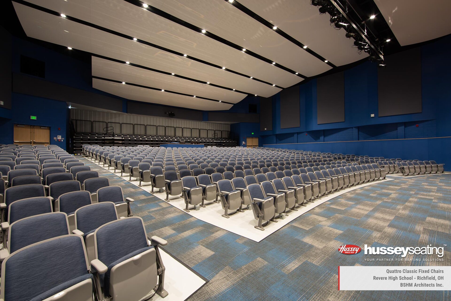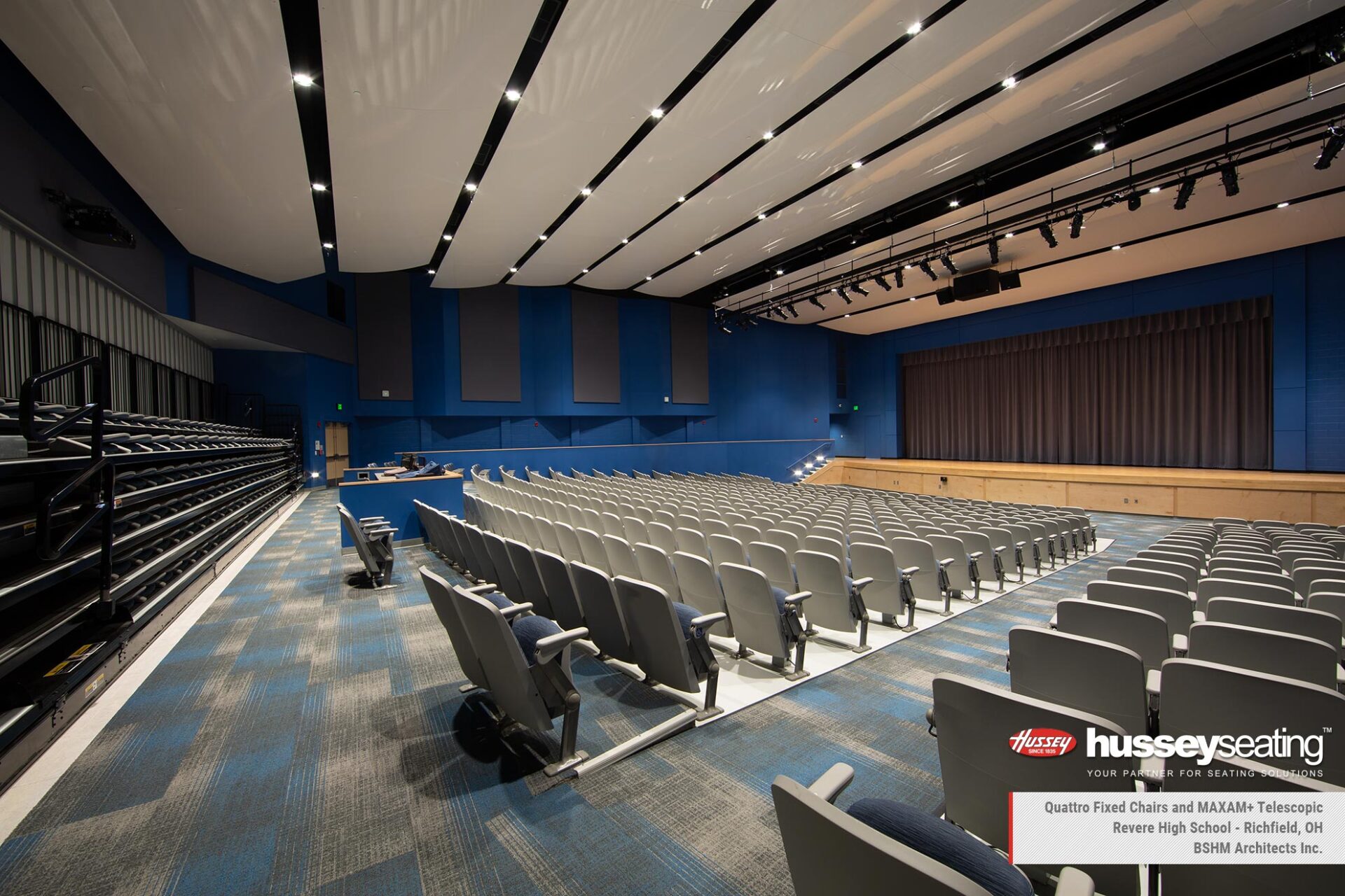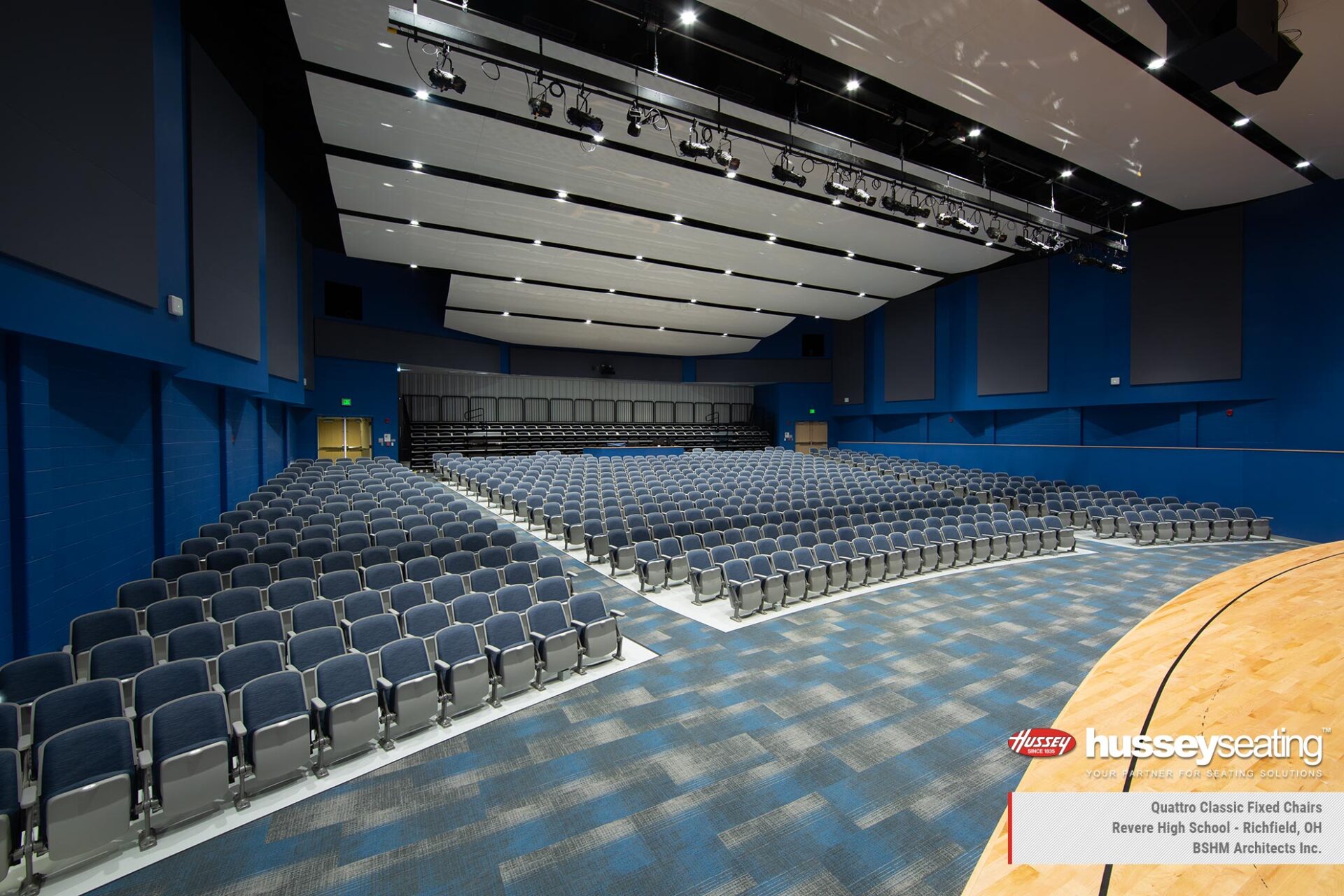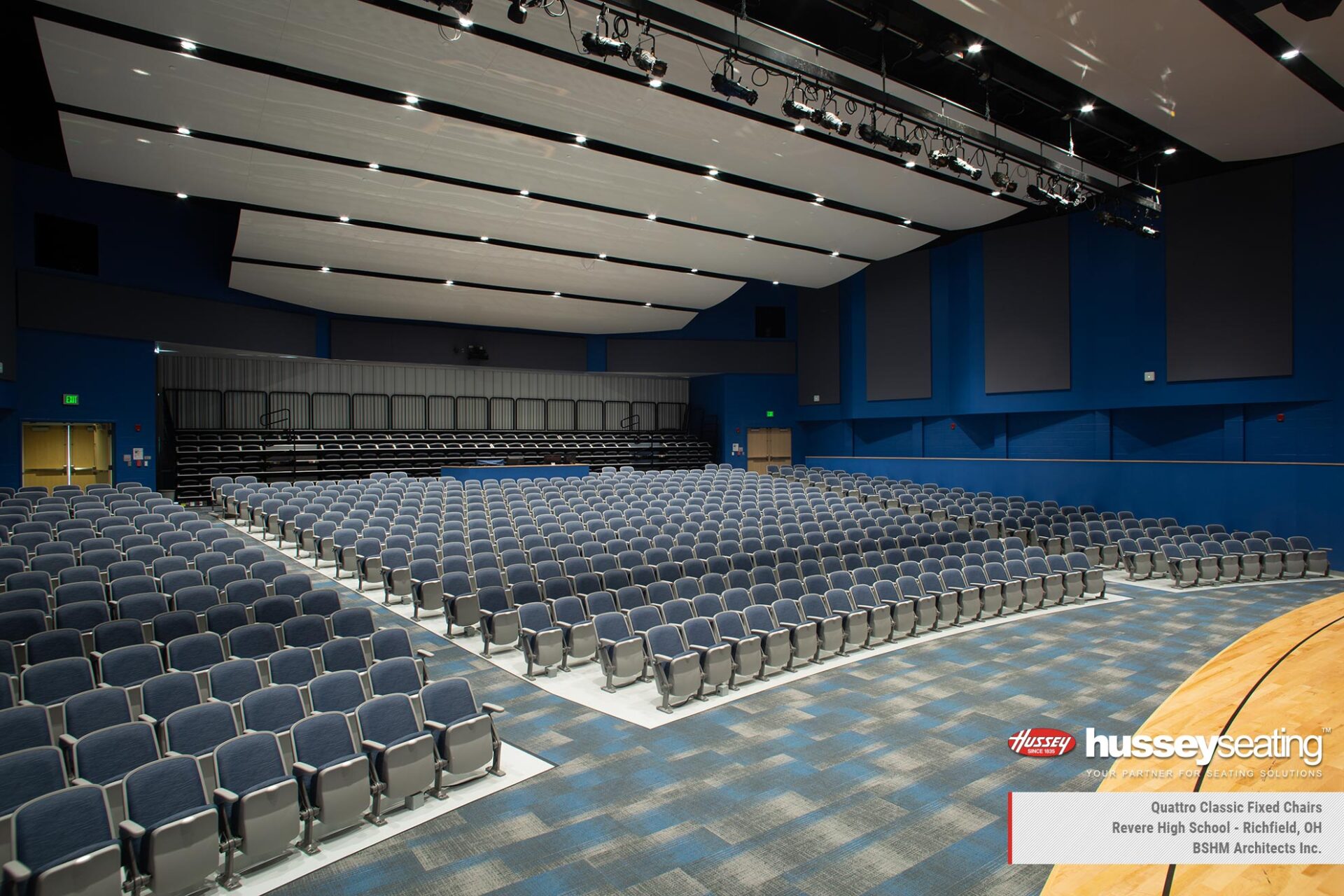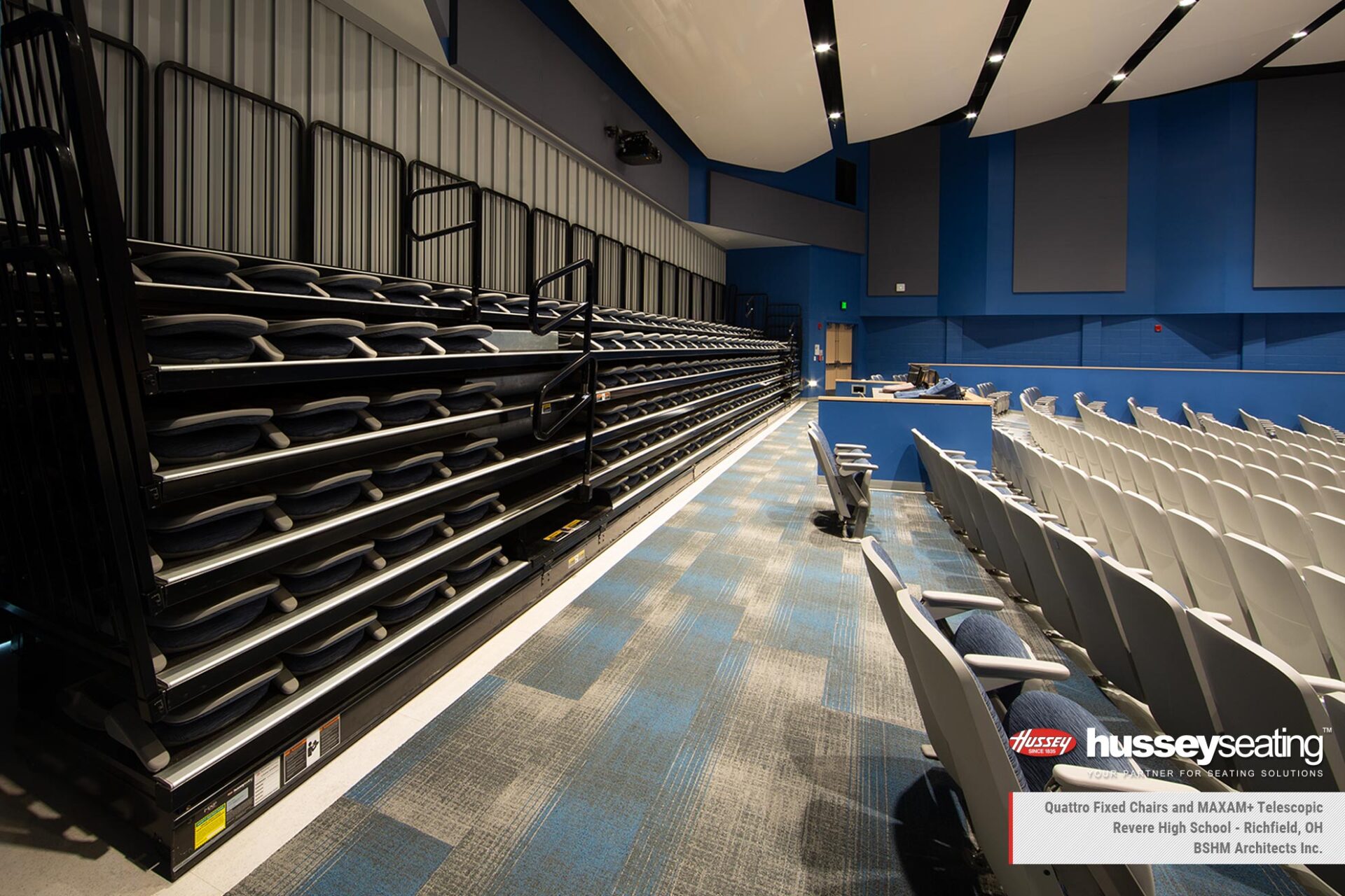 In the main gymnasium, installed are two banks of Hussey’s MAXAM telescopic bleachers finished in custom red and blue, Auto-Rotating Aisle Rails, Signature Logo and a media platform for a clear, elevated view of the action. Just steps away in the auditorium features Quattro fixed seating and a reverse-fold MAXAM+ telescopic system with Metro Chairs at the rear—adding surge seating when needed while preserving floor space when it’s not.